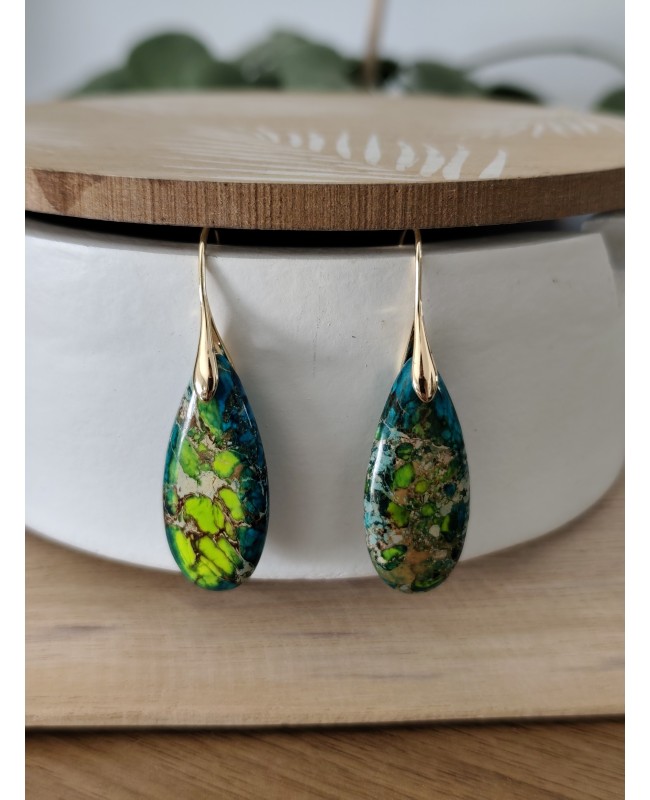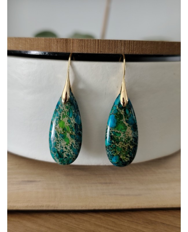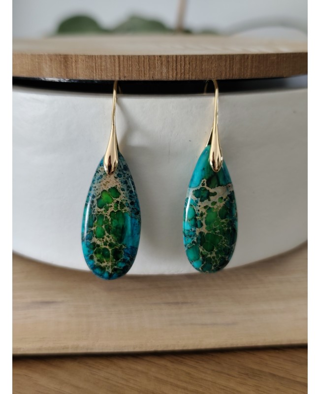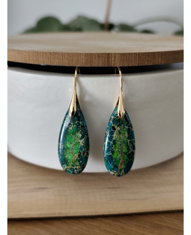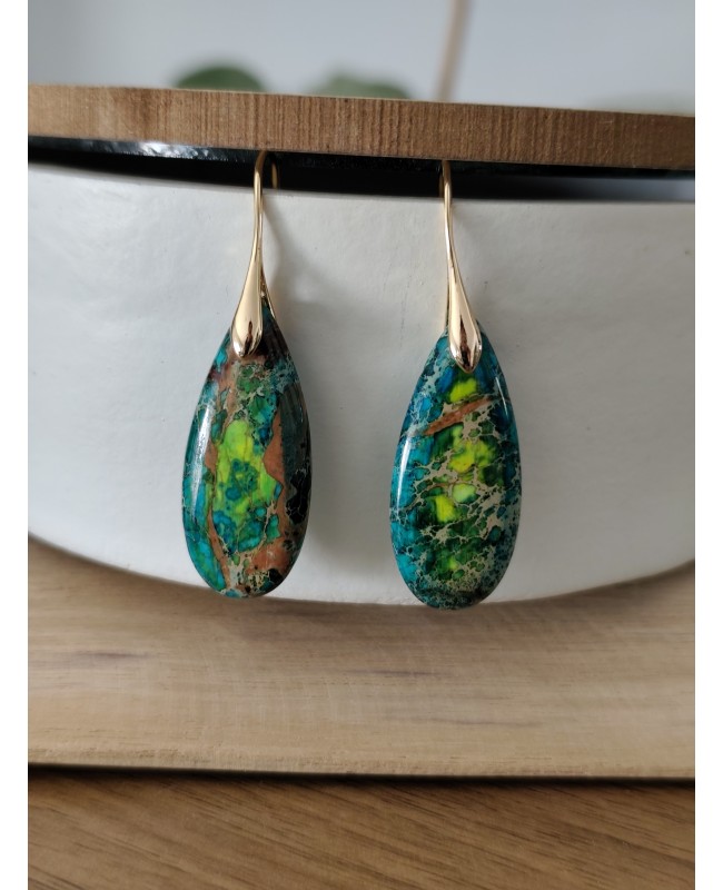 Boucles d'oreilles goutte en pierre de jaspe impérial verte ou rouge.